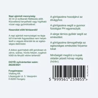 A benne lévő görögszéna hozzájárul az étvágyhoz és segíti a gyomor fiziológiai PH egyensúlyát. A sárga tárnics gyökér segíti az emésztést!