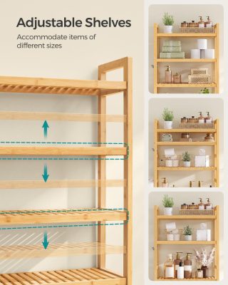• [Rugalmasan állítható] A felső 3 polc magassága állítható, így a samponokat különböző magasságban helyezheti el rajtuk. Az alján lévő rúd 10 cm vagy 16 cm-re állítható a padlótól, hogy megfeleljen a különböző WC-knek.