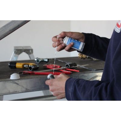 A tömítőzsinórt tekerje fel a menetre a menet irányába haladva, időnként átfedésekkel keresztezze. Az adagoló alsó részében fellelhető kenőanyagból cseppentsen 2-3 cseppnyit a tömítőszalagra, majd ujjával oszlassa el a menetre tekert szalagon. A tömítőanyag nem ártalmas, biológiailag lebomlik (folyékony oxigénnel nem használható). Fontos, hogy a menet elején kellő mennyiségű kenőanyag legyen a szalagon ami a doboz alján lévő golyós kenővel felhordható.