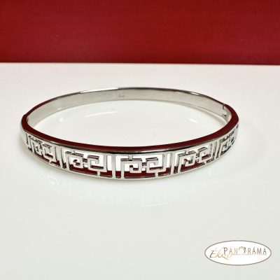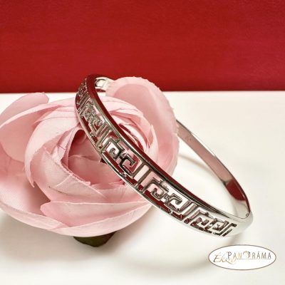 White Gold Filled anti- allergén, nyitható, ezüst színű karperec, görög mintás díszítéssel.