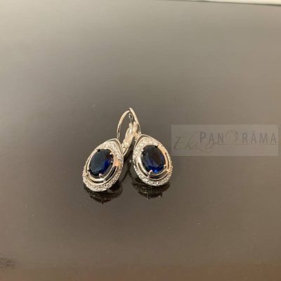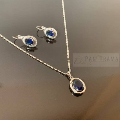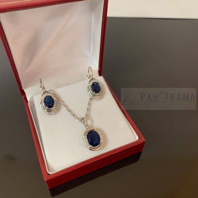 White Gold Filled ezüst színű antiallergén szett lánccal és lógós fülbevalóval. A fülbevalót és a medált sötétkék és apró fehér kristályok díszítik. A fülbevaló francia kapcsos, a szetthez díszdoboz is tartozik.