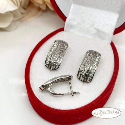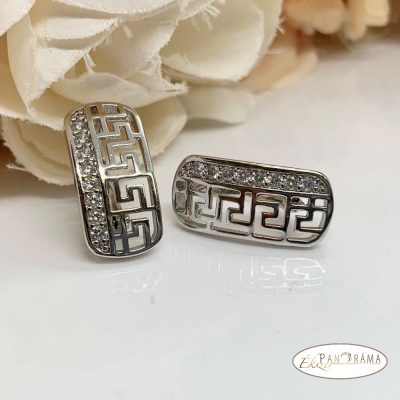 White Gold Filled anti-allergén, ezüst színű, görög mintázatú, kristályokkal díszített fülbevaló.