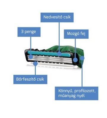 A 3 db penge a mozgó fejen biztosítja a pontos borotválást. A nedvesítő csík jó állapotban tartja a bőrt. A bőrfeszítő csík megkönnyíti az alapos borotválást. A könnyű, profilozott, műanyag nyelet úgy tervezték, hogy biztosítsa a kényelmes fogást.