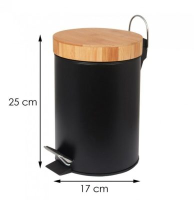 Yoka Home modern formatervezésű, esztétikus fürdőszobai mini szemetes. Porfesetett fekete rozsdamentes acél váz, bambuszfa fedővel. Pedálos nyitás, érintés nélkül. Vödrös belső tartállyal rendelkezik, így a szemetes tartalma a belső kisvödör kiemelésével könnyen üríthető.