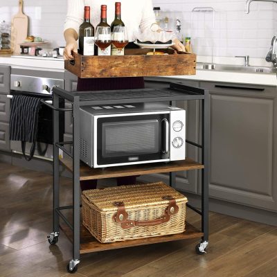 konyhai kocsi kivehető tálcával, kiszolgáló kocsi, univerzális görgők fékekkel, szintező lábak, acél szerkezet, konyhai polc, 65 x 86 x 40 cm, rusztikus barna