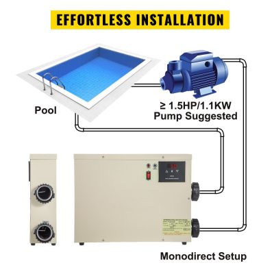 • 【KÖNNYŰ TELEPÍTÉS】 - A medencetermosztát felszerelése nem bonyolult. Részletes szerelési útmutatót és 2 db 1,96 hüvelykes (50 mm-es) interfészt biztosítunk Önnek. Beszereléskor kérjük, különböztesse meg a bemeneti és a kimeneti csövet. Javasoljuk, hogy a vízmelegítőt legalább 1,5 LE (1,1 kW) teljesítményű szivattyúval kösse be.