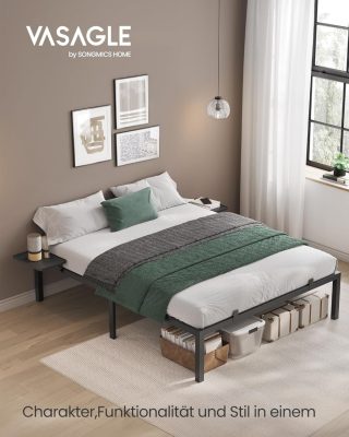 VASAGLE 160 × 200 cm-es ágy, vendégágy tárolópolcokkal, kétszemélyes ágy, fém ágykeret, könnyen összeszerelhető, klasszikus fekete