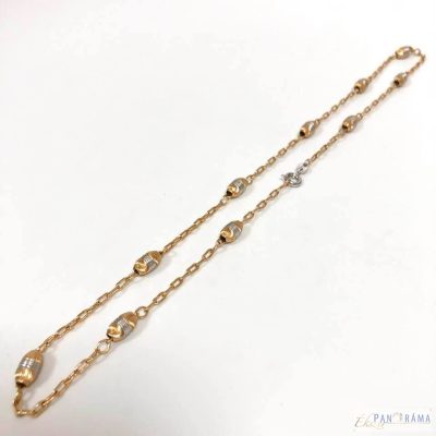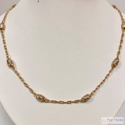 Aranyszínű láncszemei és az ovális alakú gyöngyszemei alkotják a nyakláncot.