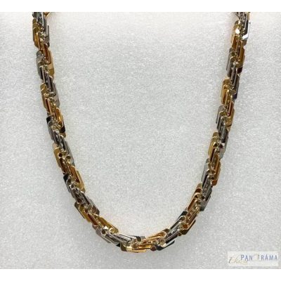 Karakteres-vastag, egymásba fonódó ezüst és arany színek váltakozása alkotja a nyakláncot, amit