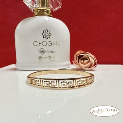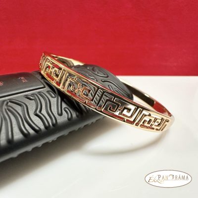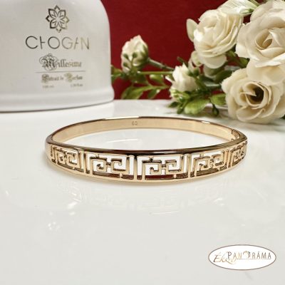 18K Gold Filled anti- allergén, nyitható, arany színű karperec, görög mintás díszítéssel.
