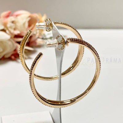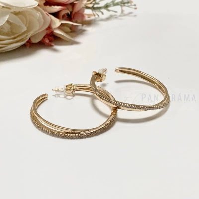 18k Gold Filled anti-allergén, nikkel és ólom mentes arany színű karika fülbevaló. Különleges kialakítású, dupla, egy sima és egy kristályos egymást keresztező szál alkotja. Beszúrós stiftes kapcsolóval.