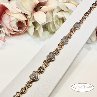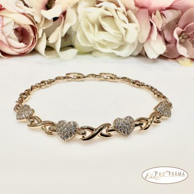18K Gold Filled antiallergén arany színű karkötő, szív és kristály díszítéssel, dupla kapcsolóval.