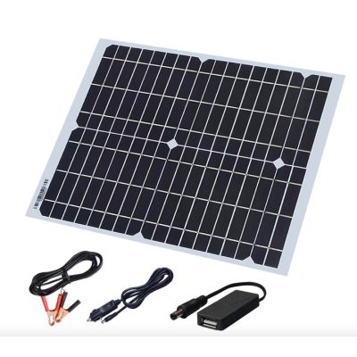 • 18V 20W napelem 5V USB, szivargyújtóval és krokodil csipeszes kábellel akkumulátor, telefon töltéshez