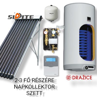 2-3 fő részére napkollektor rendszer 10 csöves vákuumcsöves napkollektor, 100 literes Drazice hőcserélős tároló, ECO szivattyú állomás, vezérlés, tágulási tartály