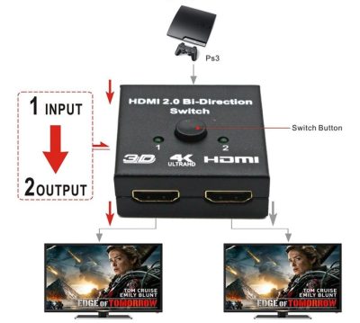 2 jelforrás kapcsolható választhatóan egy végkészülékre. Így pl. egy vevő vagy egy DVD lejátszó kapcsolható egy TV készülékre. A HDMI switchnél bidirekcionálisan gombnyomással kapcsolhatja a vevő vagy a DVD lejátszó jelét a TV-re. Az átkapcsolás manuálisan történik, nem automatikusan.