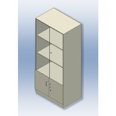 Laminált bútorlapból készült szekrénytest, felül 2 üvegajtóval. Alsó és felső ajtók biztonsági zárral vannak ellátva. Alapszín: fehér.
