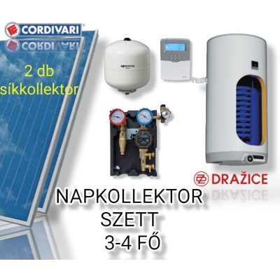 3-4 fő részére Cordivari síkkollektoros szett: 2 síkkollektor + 160 literes 1 hőcserélős bojler + ECO szivattyú állomás + vezérlés + tágulási tartály