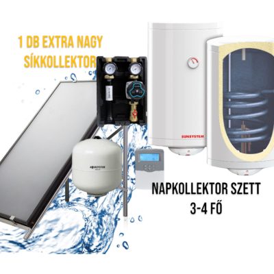 • 3-4 fő részére exra nagy síkkollektoros szett HMV készítés: 1 síkkollektor + 150 literes Sunsystem hőcserélős bojler + szivattyú állomás + vezérlés + tágulási tartály