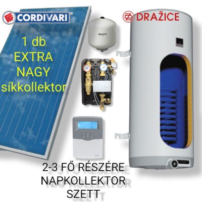 • 3-4 fő részére síkkollektoros szett: 1 db 2,5 nm Cordivari nagy síkkollektor + 160 literes 1 hőcserélős bojler + szivattyú állomás + vezérlés + tágulási tartály