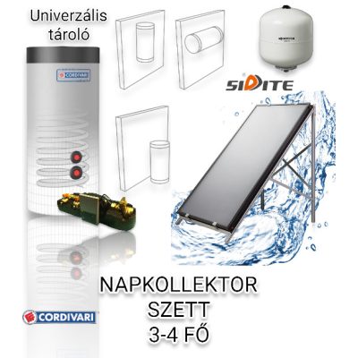 3-4 fő részére síkkollektoros szett: 1 db 2,5 nm nagy síkkollektor, Cordivari 150 literes 1 hőcserélős bojler, szivattyú állomás vezérléssel, tágulási tartály