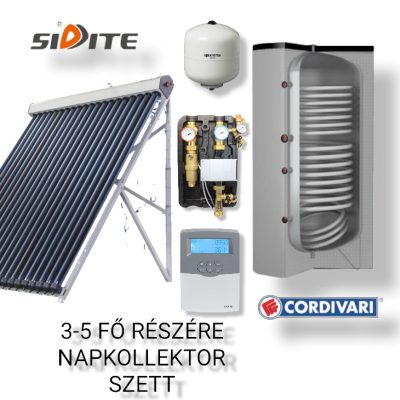 • 3-5 fő részére napkollektor rendszer: 20 vákuumcsöves napkollektor + 200 literes 2 hőcserélős Cordivari álló bojler + szivattyú állomás + vezérlés + tágulási tartály
