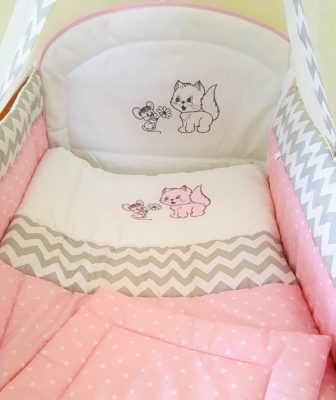 3 részes babaágynemű szett - Rózsaszín csillagos chevron cica - egér