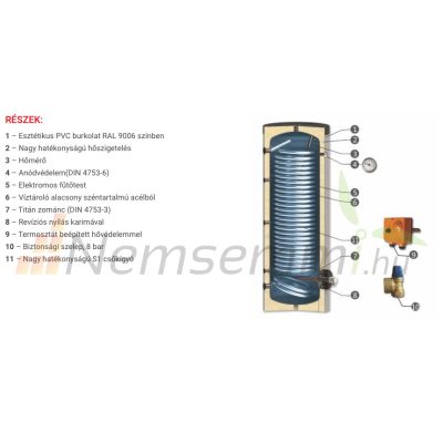 1 hőcserélővel ellátott keskeny HMV tartály extra nagy felületű csőkígyóval