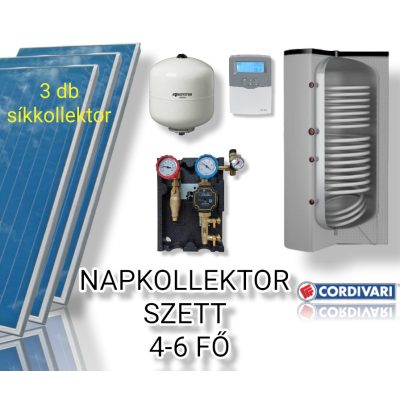 4-6 fő részére Cordivari napkollektor rendszer: 3 db prémium sikkollektor, 300 literes 2 hőcserélős álló bojler, ECO szivattyú állomás, vezérlés, tágulási tartály