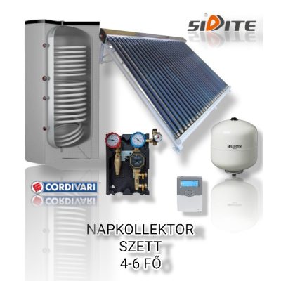 • 4-6 fő részére napkollektoros rendszer: 30 vákuumcsöves napkollektor + 300 literes 2 hőcserélős Cordivari álló bojler + Environ szivattyú állomás + vezérlés + tágulási tartály