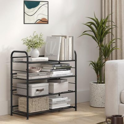 4 szintes cipőtartó, egymásra rakható tárolópolc akár 16 pár számára, fém, 68,5 x 27,5 x 65 cm, magassarkúhoz, edzőcipőhöz, papucshoz, bejárathoz, fekete: