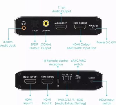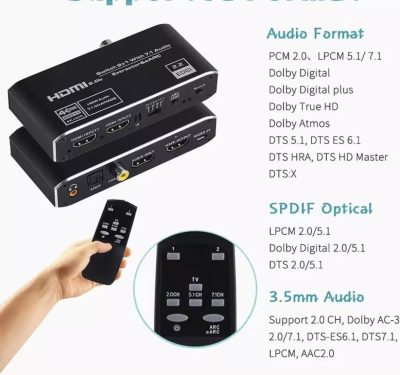 • 4K HDMI Switch 2 port 2 in 1 Out HDMI2.0b Switcher Audio Extractor eARC 7.1 CH optikai Toslink HDCP2.3 csatlakozóval