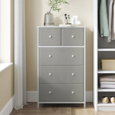 Komód Tárolószekrény 5 Szövet fiókos Előszoba Nappali Világosszürke Fehér: