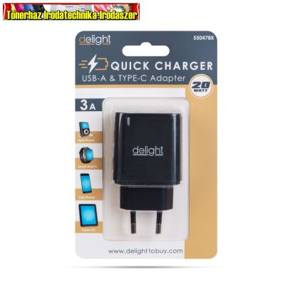 • 55047BK Hálózati Adapter USB + Type-C PD20W gyorstöltéssel - fekete