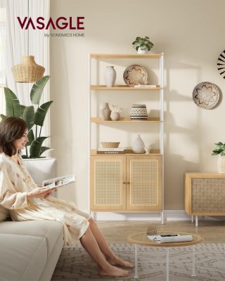 • 6 szintes könyvespolc, magas állópolc rattanszerű ajtókkal, boho stílus, tölgy bézs és fehér