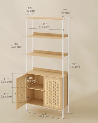 6 szintes könyvespolc, magas könyvespolc rattanszerű ajtókkal, Boho stílusú, szabadon álló polcegység, fém keret, állítható polc, nappaliba, tölgy bézs és gyöngyházfehér