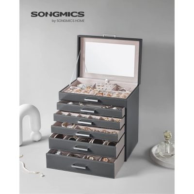6 szintes nagy ékszerdoboz fiókokkal és tükörrel, alkalmas karkötők, fülbevalók, nyakláncok, gyűrűk és órák tárolására, ajándékötlet