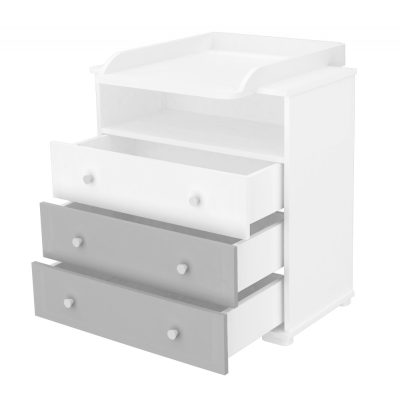 Egy sokoldalú, minden igényt kielégítő pelenkázószekrény, mely a legideálisabb választás kisebb szobák berendezése esetén. Egyszerre szolgál nyitott polcos részel és fiókokkal, amik kiválóan pakolhatóak, jól átláthatóak és remekül rendszerezhetőek, mely igen fontos ha a kicsik holmiairól van szó.