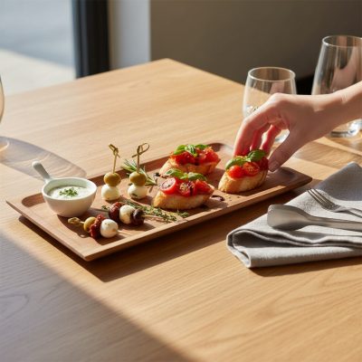 • Természetes megjelenés: a meleg tónusú akáciafa kiemeli az ételek színeit.