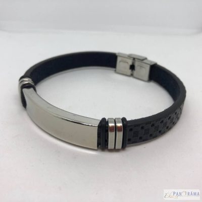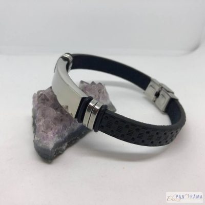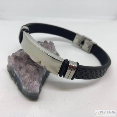 Fekete bőr szíjas, külőnleges, acél betétes karkötő.