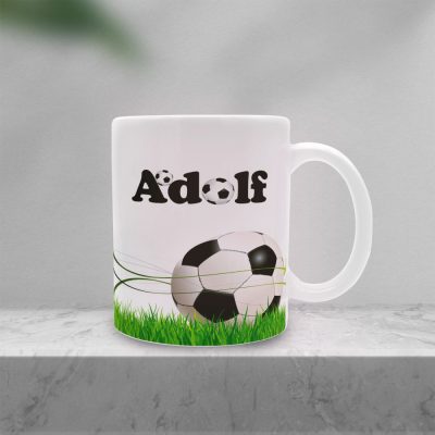 Az elegáns fehér színű bögre elülső részén a választott név büszkélkedik, míg az alsó részen pedig egy futball motívum található. Ez a bögre a mindennapi használatra is alkalmas, és remekül mutat bármilyen konyhaszekrényben vagy irodai asztalon.