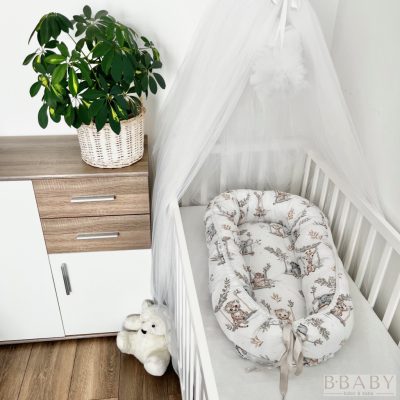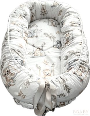 A fészek belső oldala pamut anyagból készült, amely kellemes tapintásával megnyugtatja az újszülöttet. A külső réteg strapabíró, jól szellőző pamutvászon, amely tartós használatra lett tervezve. A fekvőfelületet antiallergén vatelin és szivacs tölti ki, így babád kényelmesen és biztonságban pihenhet benne – akár a kiságyban, akár a kanapén vagy utazás közben.