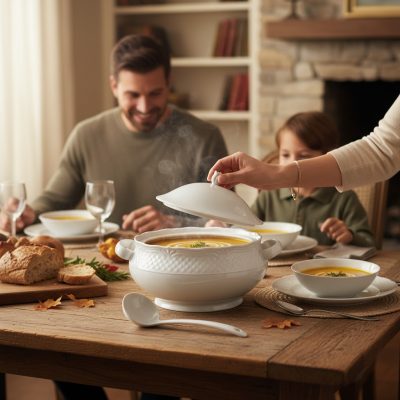A 2,7 literes kapacitás bőségesen elegendő akár több adag leves, főzelék vagy egytálétel tálalásához. A hozzáillő porcelán fedél segít megőrizni az ételek hőmérsékletét és aromáját, így a tálalás során az étel tovább marad friss és ízletes. A tál fogantyúi biztonságos fogást nyújtanak, így a szervírozás is egyszerű és elegáns.