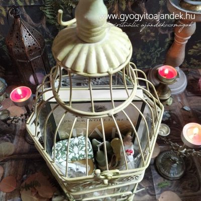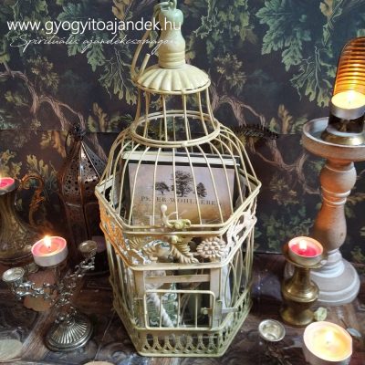 Vintage kalitába zárt ajándékcsomag, mely a fák titkos életéről szól. Ez a csodás zöld színű antokolt, nagynéretű fém kalitka mesés dísze lesz otthonodnak, teraszodnak. Képzeld csak el, ahogy egy nyári délutánon, kezedben egy remek könyvvel üldögélsz és elmélyedsz a fák titokzatos életének epizódjaiban. Peter Wohlleben német erdész és író ezzel a csodálatos könyvvel betekintés nyújt az erdő titkaiba. Az ajándékcsomagban találsz egy kerámia angyalt és az Erdő titkos kulcsát:) Ha lefekvés után olvasgatnál, fürödj meg előtte a magas klorofilltartalmú kender luxus szappannal, mely az erdő érzéki illatát kölcsönzi amellett, hogy jótékony bőrnyugtató hatása van. Gyújtsd meg a szép zöld gyertyákat, vedd kezedbe a könyvet és merülj el az erdő titkaiban.
