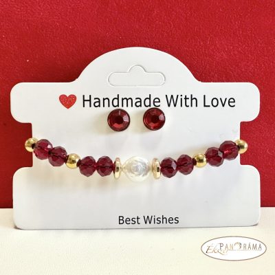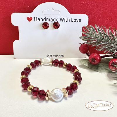 Piros antiallergén beszúrós fülbevaló, valamint egy kézi készítésű ásvány karkötő közepén lapos gyönggyel díszítve