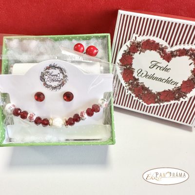 Gyönyörű karácsonyi díszdobozban piros kristályos beszúrós fülbevaló, egy kézi készítésű ásvány karkötővel, valamint a Chogan legújabb 148W illata egy utántölthető, bőr hatású, 10 ml táskaparfümben