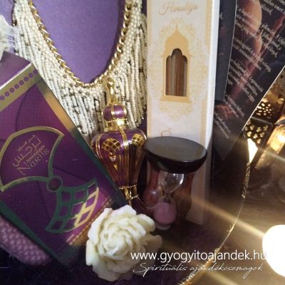 Ékszer és parfüm kedvelők figyelmébe ajánjluk ezt a különleges ajándékcsomagot, mely lila, arany és krém színekben pompázik. Ízlésesen összeválogatott tárgyak, minőségi díszdobozban.