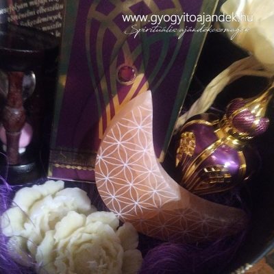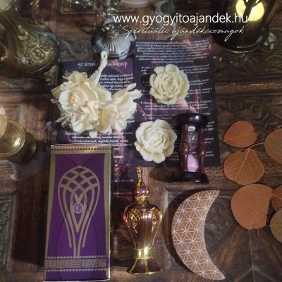 Ásvány és parfüm kedvelők figyelmébe ajánjluk ezt a különleges ajándékcsomagot, mely lila, arany és krém színekben pompázik. Ízlésesen összeválogatott tárgyak, minőségi díszdobozban.