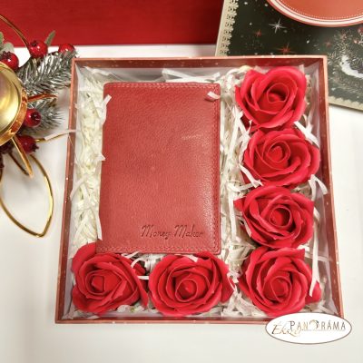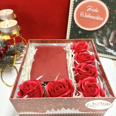 Igényes ajándékcsomag karácsonyi díszdobozban - Piros valódi bőr irattartó 6 db 5 cm-es, piros illatos szappanrózsával