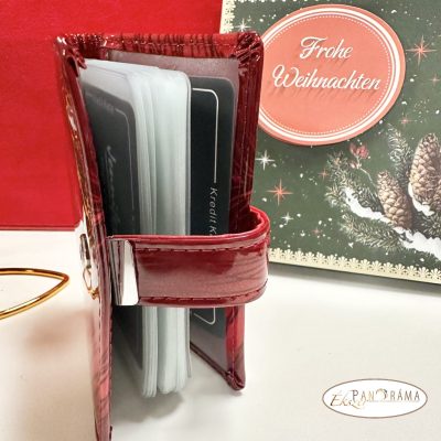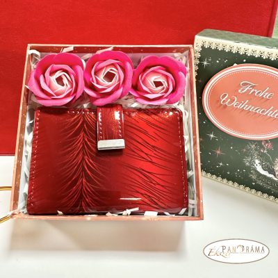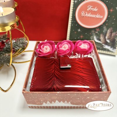 Igényes ajándékcsomag karácsonyi díszdobozban - Piros valódi bőr lakk irattartó szappanrózsával