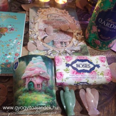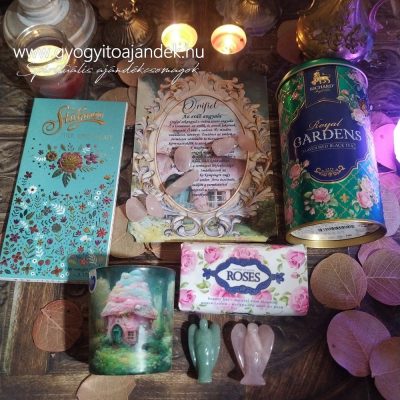 A finom gyümölcsös illatok és édes aromák kedvelőinek ajánljuk ezt az ajándékcsomagot. Olvasás, finom forró tea, csoki evés, fürdés egy luxus szappannal miközben egy csodás illatgyertya aromája lengi be a teret. Akár mindezt egyszerre. Közben 2 angyalka őrzi a nyugalmadat, egy rózsakvarc és egy aventurin.